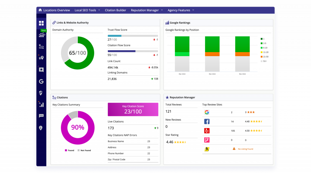 Buna ek olarak, yerel paket ve yerel bulucu gibi denetim yeteneklerinin bir kısmı, hem Google hem de Bing’den ayrıntılı organik sıralama raporlarının yanı sıra, farklı Google yerel konumlarına odaklanan ayrıntılı raporlama sistemiyle de sıralamaları izleme olanağı tanır.
