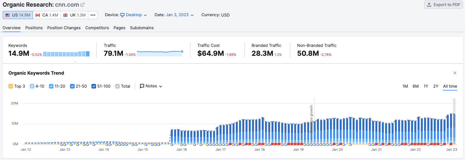 Normalde Semrush’u teknik bir analiz aracı olarak düşünmeyebilirsiniz. Ancak, derinlemesine bir rakip analizi yapacak olursanız, sunduğu sıralama ve rakip analizi verileriyle sizi şaşırtabilir.