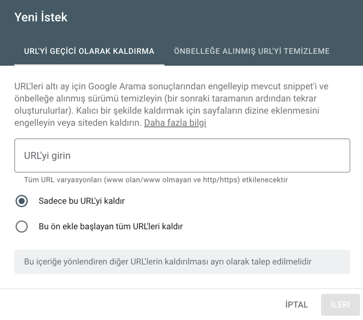 Karşınıza çıkan ekrandan “Sadece bu URL’yi kaldır” seçeneğini işaretlerseniz sadece girdiğiniz URL’i silmiş olursunuz. “Bu ön ekle başlayan tüm URL’leri kaldır” seçeneğini işaretlediğinizde ise bir belirtilen folder altındaki tüm URL’leri kaldırmak istediğinizi belirtirsiniz. Silinecek URL belirtildikten sonra ileri butonuna tıklayın ve silmek istediğiniz URL’i doğruladıktan sonra “İstek Gönder” butonuna tıklayarak URL kaldırma işlemini gerçekleştirin.