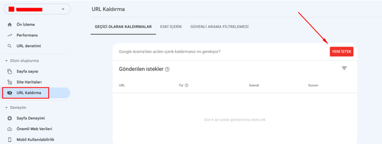 Bu ekranda son 6 ay içerisinde gönderilen  URL kaldırma isteklerini görmeniz mümkün. “Yeni istek” butonuna tıklayarak yeni bir silme işlemi başlatın.