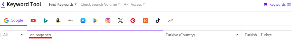 Bu araç, kullanıcıların popüler arama motorlarındaki (Google, YouTube, Bing, Amazon, eBay gibi) arama sorguları için potansiyel anahtar kelimeleri keşfetmelerini sağlar. Keywordtool.io’yu kullanmak için ilk adım olarak, hedef anahtar kelimeyi girmelisiniz.
