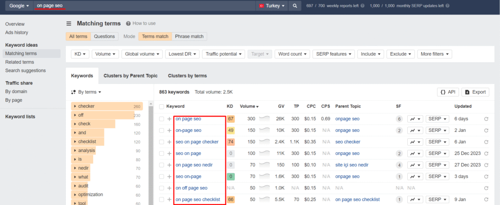 Ardından açılacak olan ekranda hedef anahtar kelimenizi girerek kelimeye dair hacim, kelime zorluğu, eşleşen terimler gibi birçok istatistiğe ulaşabilirsiniz. Son adım olarak eşleşen terimleri seçtiğinizde ise anahtar kelimenize uygun LSI anahtar kelimeler neler, hepsi listelenmiş olacak.