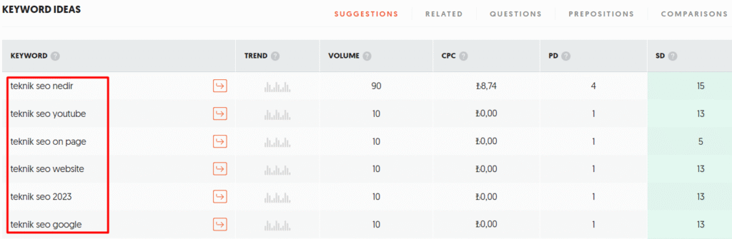 Übersuggest kullanım açısından Keywordtool.io’ya oldukça benzemektedir. Anahtar kelimenizi ilgili alana yazıp arattıktan sonra Übersuggest size ilgili anahtar kelimeleri, aylık aranma hacmini, zorluk seviyelerini ve tıklama maliyetini içeren detaylı istatistikler sunar.