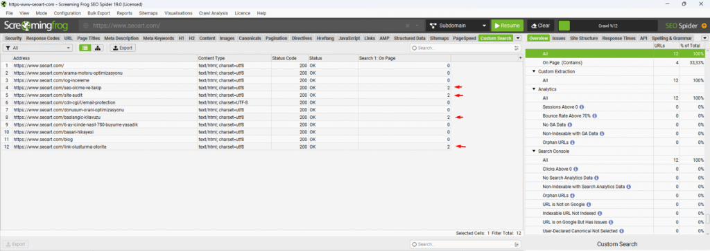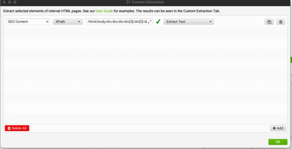 Örneğin sayfa altı SEO Content’i olan sayfaları belirlemek istiyorsunuz. SEO conent’ine ait Xpath’i kopyalayıp Custom Extraction özelliğiyle tarayabilirsiniz.