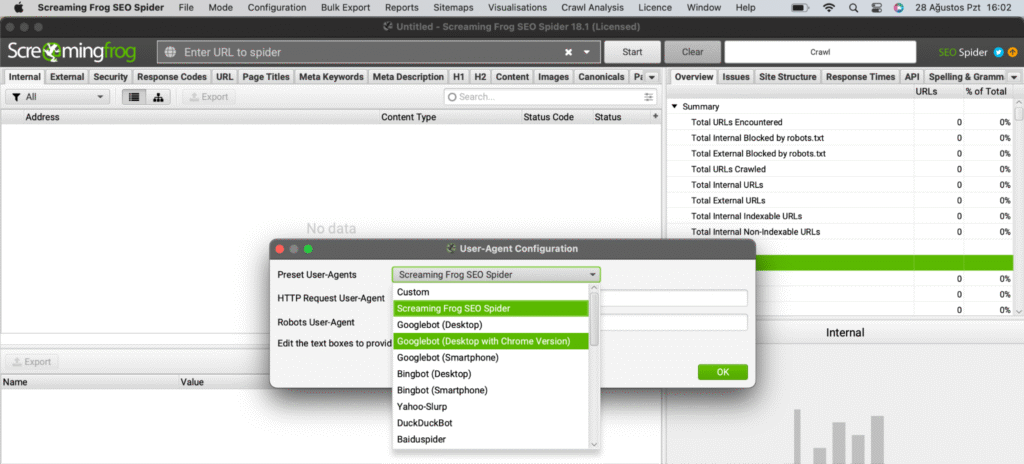 Screaming Frog ile tarama yaparken farklı user agent seçerek taranan sayfaların farklı user agten’lar tarafından nasıl göründüğünü kontrol edebilirsiniz. Screaming Frog’ta user agent değiştirmek için Configuration > User Agent menüsüne tıklayabilir ve açılan pencereden seçiminizi yapabilirsiniz.