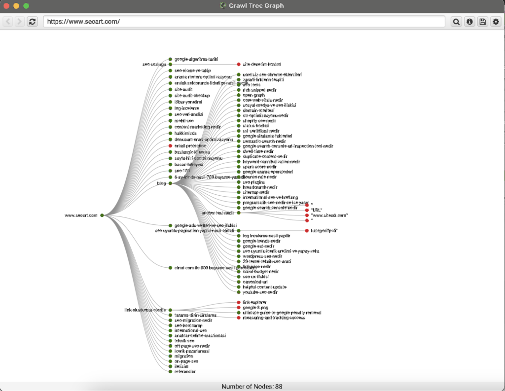 Tree Graph özelliğiyle web sitesindeki link dağılımını ve kategori ağaçlarını kolayca görebilirsiniz. Tree Graph özelliğini kullanmak için tarama bittikten sonra üst menüde yer alan Visualisations > Crawl Tree Graph seçeneğine tıklayın. Böylece taranan sitenin link dağılımını ve kategori ağacını görebilirsiniz.