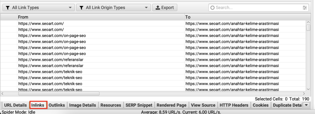 Inlinks özelliği ile taranan URL’lerin web sitesinin neresinde linklendiğini görmek mümkündür. Kontrol edilmek istenen URL veya URL’leri seçerek inlinks sekmesine tıklayın. From sütununda linklenen sayfayı, To sütununda da link verilmiş URL’i görebilirsiniz.