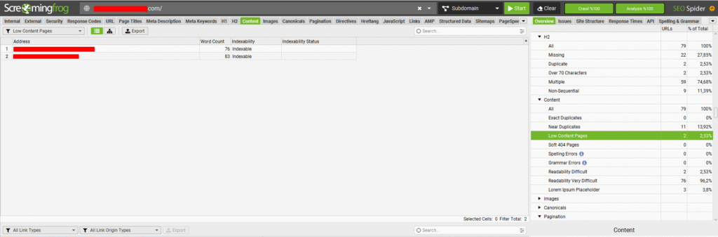 Tarama sonuçlandıktan sonra sağda yer alan “Overview” ekranında “Content” sekmesine tıkladığınızda, taranan URL’leri ve bu URL’lerin content açısından değerlendirmelerini görebilirsiniz. “Low Content Pages” seçeneğine tıklayarak, sayfa içeriği zayıf ve çok az metin bulunan sayfaları tespit edebilirsiniz. Özgün ve yeterince uzun olmayan içerikler kullanıcılara fayda sağlamayacağı için arama motorları için de yetersiz olarak görülecektir. Bu sebeple Low content Pages listesinde sizin için önemli sayfalar var ise bu sayfalardaki içeriği geliştirmek faydalı olacaktır.