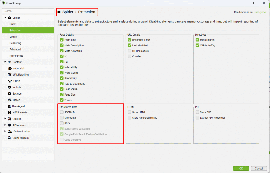 Sayfalarda yer alan Structured Data çeşitlerini incelemek ve kontrol etmek için Screaming Frog’tan yardım alabilirsiniz. Bunun için öncelikle “Configuration” menüsüne tıklayarak Spider > Extraction menüsüne gelmelisiniz. Bu menüden kontrol etmek istediğiniz Structured Data formatlarını işaretlemelisiniz.