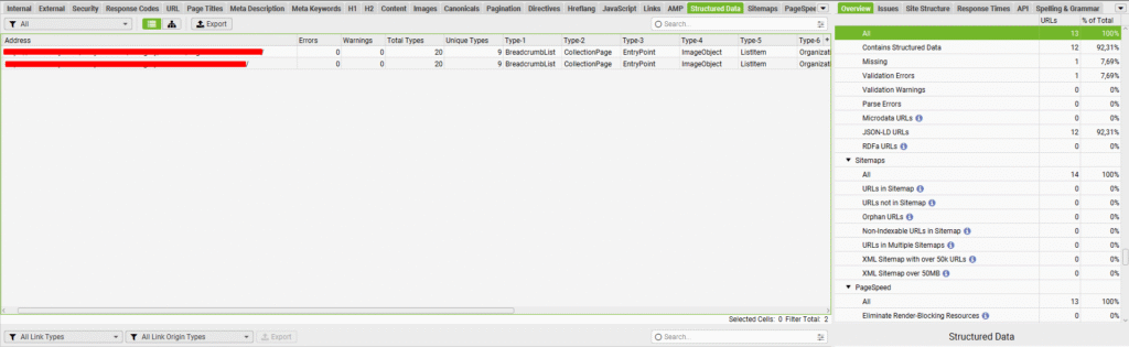 Format seçimini yaptıktan sonra taramayı başlatabilirsiniz. Tarama sonrasında aşağıdaki ekran görüntüsünde olduğu gibi taranan sayfalarda yer alan Structured Data formatlarını görebileceksiniz.