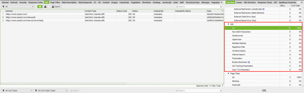 URL’lerin bu önergelere uygunluğunu tespit etmek için Screaming Frog’tan yararlanabilirsiniz. Bunun için tarama yaptıktan sonra Overview ekranında yer alan URL sekmesine tıklayın. Burada URL’lerin büyük harf, alt çizgi, boşluk ve türkçe karakter içeren URL’leri görüntüleyebilirsiniz.