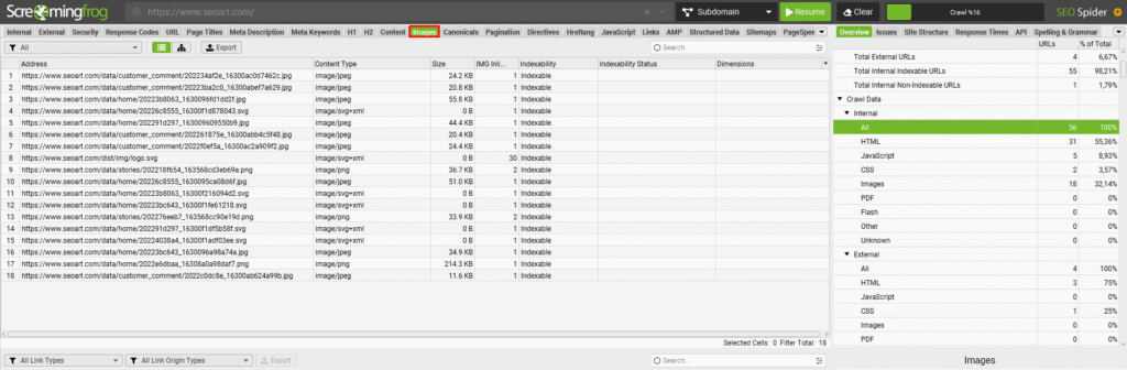 Screaming Frog, sayfalarda yer alan görselleri tarayarak görsellerin boyutlarını görebilmeyi sağlar.Tarama yaptıktan sonra üst menüde yer alan “images” sekmesine tıklayarak sayfalarda yer alan görsellere, dosya uzantılarına ve boyutlarına dair bilgilere ulaşabilirsiniz. Böylece boyutu yüksek görsel dosyalarını tespit edebilir ve optimize ederek boyutlarını küçültebilirsiniz.