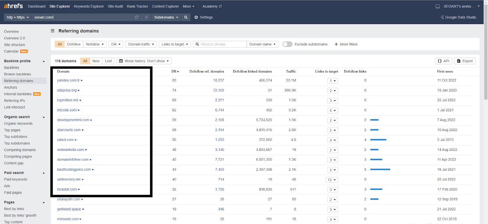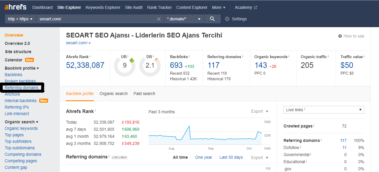 Sonraki adım, “Referring Domains” yani “Bağlantı Veren Domainler” sekmesine tıklayarak, web sitemize hangi domainlerden backlink geldiğini inceleyebiliriz.