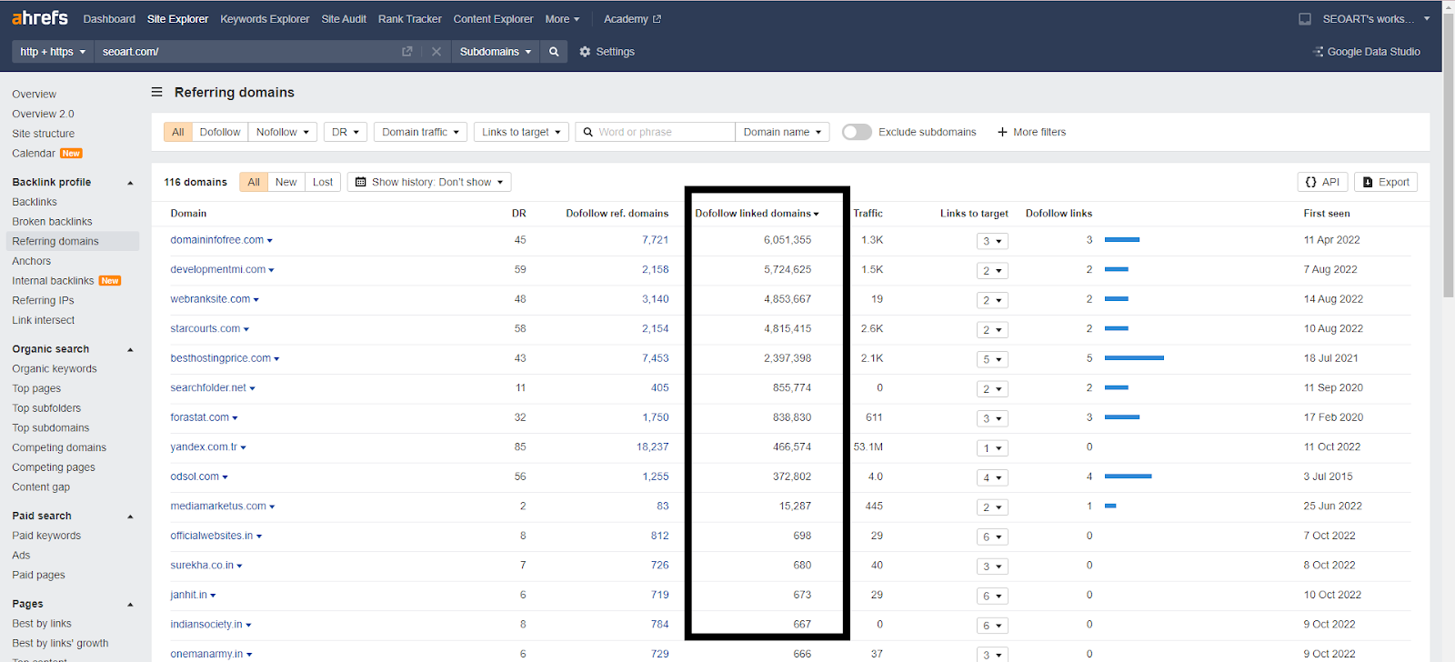 Zararlı linklerin tespitinde önemli bir faktörün, domainden link çıkışı yapılan site sayısının olduğunu yazımızın önceki bölümünde belirtmiştik. Aşağıdaki resimde göreceğiniz “Dofollow Linked Domains” yani “Dofollow Link Veren Domainler” sütununda yer alan rakamlar, backlink aldığımız domainlerin kaç adet siteye backlink verdiğini göstermektedir.