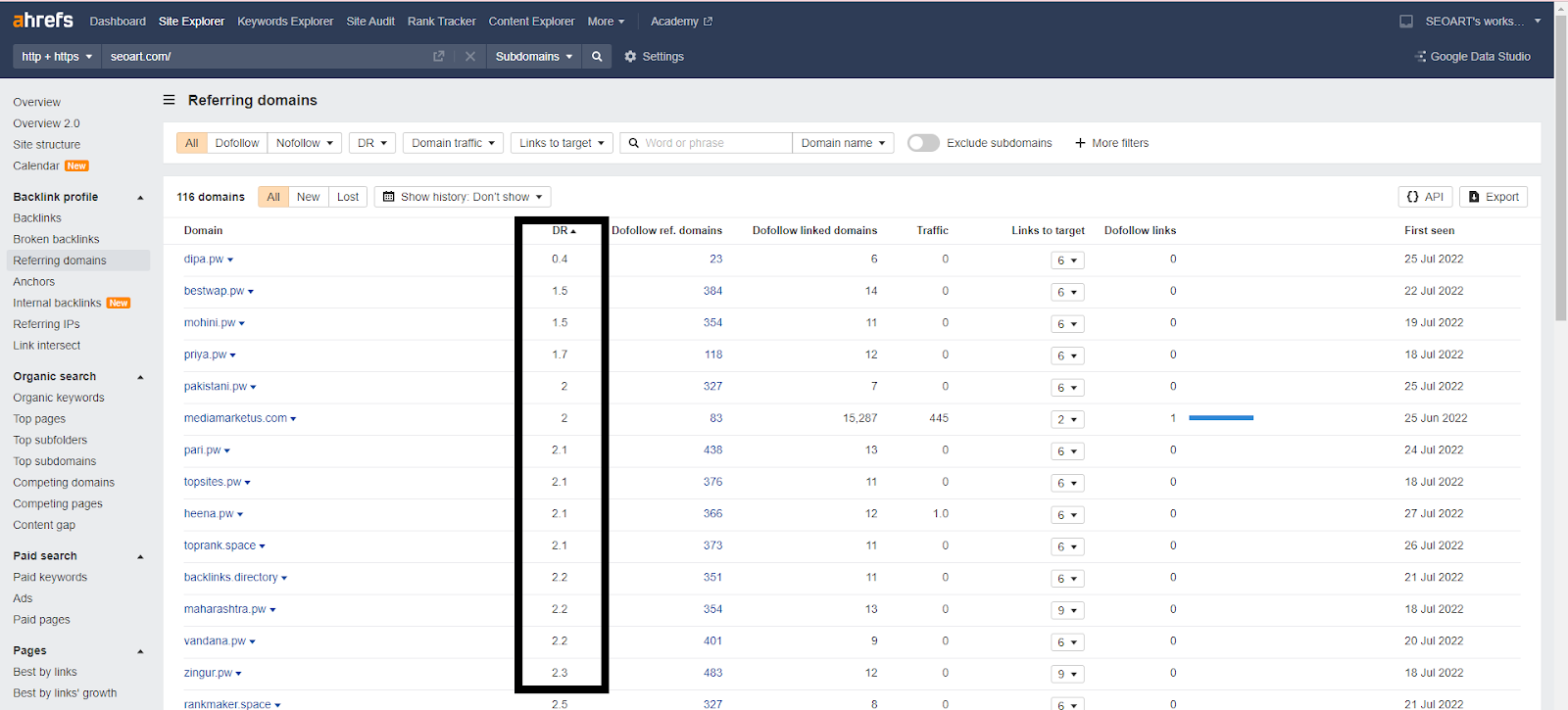 Aşağıdaki resim bu sekmeye tıkladığımızda açılan sayfayı göstermektedir. Bu sekmede DR değeri 10’un altında olan siteler tespit edilmeli ve bir not defterine not edilmelidir.