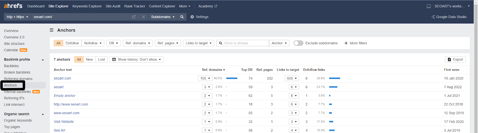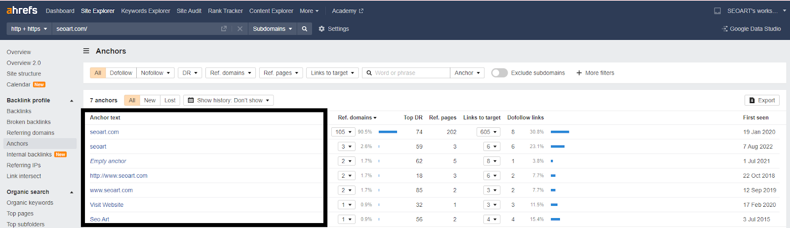 Bir web sitesinin aldığı backlinklerin kalitesini belirleyen önemli bir unsur da bu linklerin hangi anahtar kelimeler üzerinden verildiğidir. Çünkü kullanıcılar bu kelimelere tıklayarak ilgili web siteye erişirler. Bu bilgiye erişebilmek için sol kısımda bulunan “Anchor” yani “Bağlantı metinleri” sekmesine tıklayabiliriz.