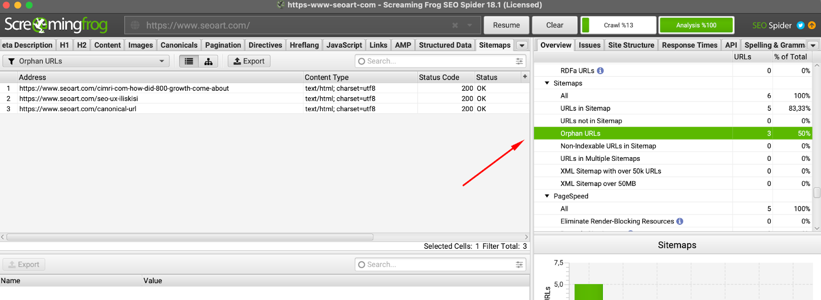 • Tarama bittikten sonra solda yer alan Overview ekranında Sitemaps maddesinin altında yer Orphan URLs alanından kaç sayfanın yetim sayfa olduğunu görebilirsiniz.