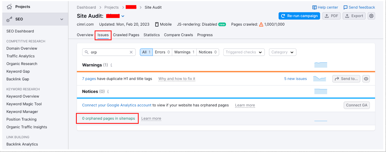 Semrush’ın site audit özelliğini kullanarak yetim sayfaları tespit etmek mümkün. Kontrol edeceğiniz web sitesi için site audit kurduktan sonra tarama sonuçlarını açarak issues sekmesine gelin. Tarama esnasında iç link verilmemiş sayfalara rastlanırsa Orphaned pages in sitemap raporunda görebilirsiniz.