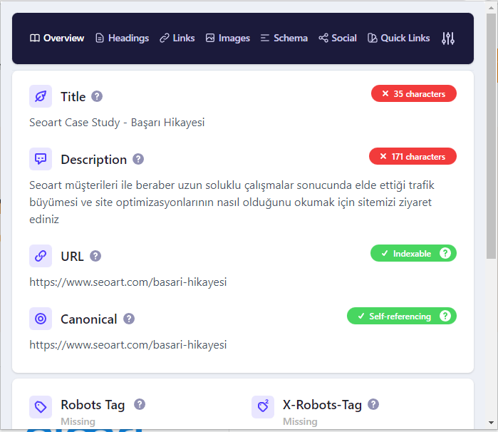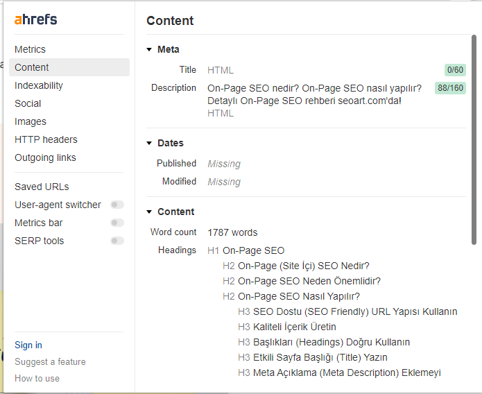 • Sayfa içeriğine dair bilgiler (kelime sayısı, başlıklar)
