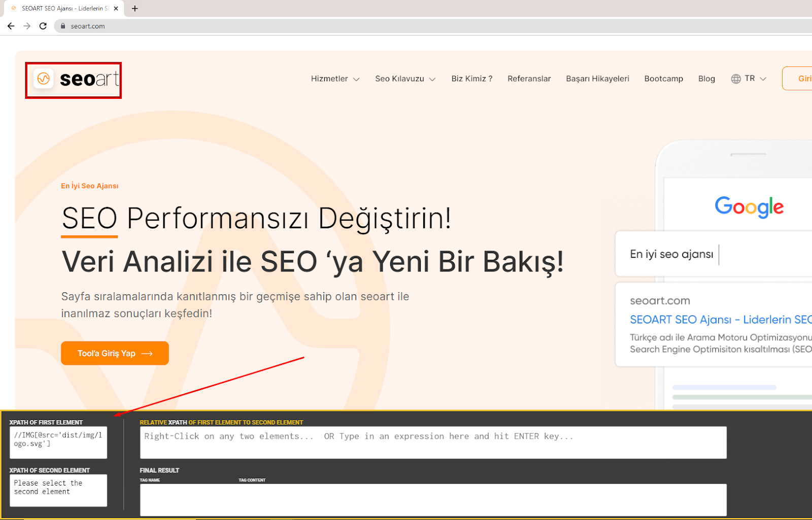 Tek yapılması gereken uzantıya ait simgeye tıklamak ve sayfa içerisindeki text, görsel, alan, aranmak istenen her neyse buna sağ tıklamak. Tıklama sonrasında “x-path of first element” kutucuğunda ilgili elemente ait sorguyu bulabilirsiniz.