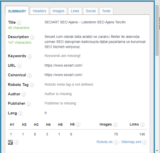 • Sayfanın hangi hangi sitemap dosyasında konumlandığı ve siteye ait robots.txt dosya uzantısı hakkındaki bilgiler.