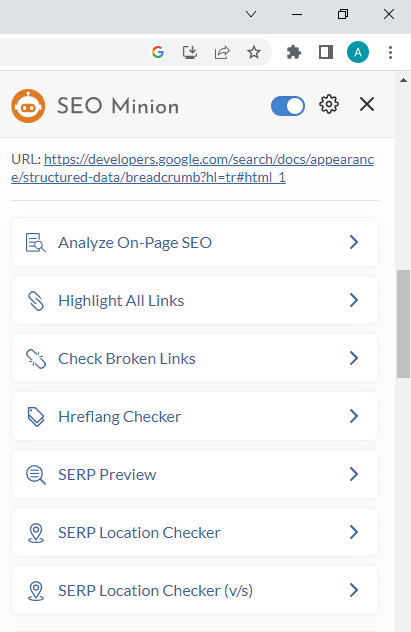 SEO Minion uzantısı On Page SEO analizi yapabilen, sayfadaki bağlantıları işaretleyen, kırık linkleri ve hreflang etiketlerini inceleyebildiğiniz ücretsiz bir chrom uzantısıdır. Uzantıyı kullanabilmek için sayfanın bir defa yeniden yüklenmesi gereklidir.
