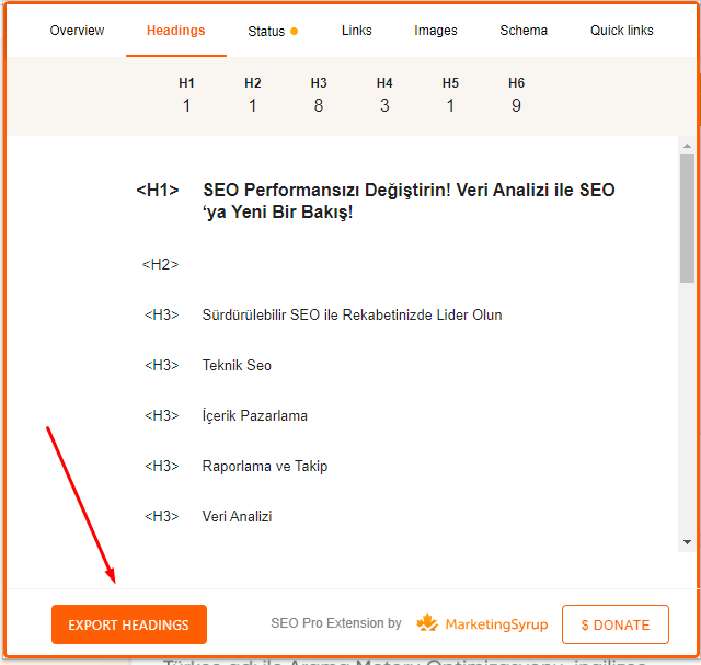 Bu uzantının diğer on page SEO chrome uzantılarından en büyük farkı export alabilme özelliğinin olmasıdır. Sayfada bulunan başlıkları, iç ve dış linkleri, görsellere ait verileri tek tıklamayla excel formatında indirme kolaylığı sunar.