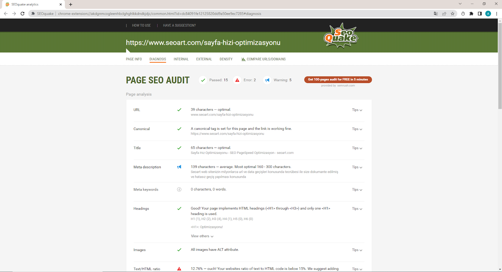 SEOquake Semrush tarafından geliştirilen, SEO uzmanları tarafından sıkça kullanılan bir chrom uzantısıdır. İster Semrush hesabına bağlayarak, isterseniz giriş yapmadan kullanabilirsiniz. Diğer SEO uzantılarından en büyük farkı, sayfayı önemli metriklere göre değerlendirerek bir On-Page SEO Checklist oluşturmasıdır.