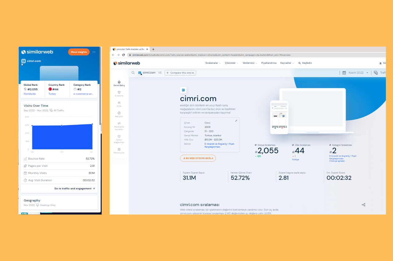 Bu uzantı ile web sitesine ait organik ve paid trafik verilerini, rakiplerini, trafik kaynaklarını yani önemli bilgileri hızlıca görebilirsiniz. Web sitesinin dünyada ve ülkedeki sıralamasını, bounce rate yüzdesini, en çok trafik getiren ülkeleri ve kanalları inceleyebilirsiniz. More insights bağlantısına tıklayarak ilgili sayfaya ait daha detaylı verilerin olduğu bir rapora ulaşabilirsiniz.