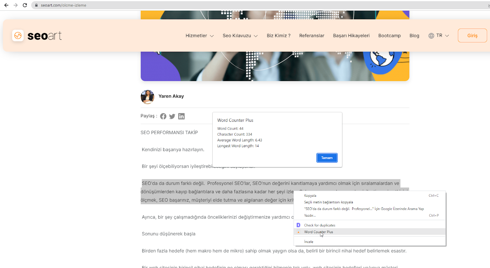 Belirli bir metin aralığındaki kelime sayısını öğrenmek istiyorsanız Word Counter Plus chrome eklentisini yükleyebilirsiniz. Uzantının sağladığı diğer veriler ise şunlardır: